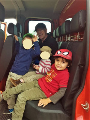 Die drei Jungs sind Feuer und Flamme - heute gibt es Feuerwehrautos, Ambulanz, Polizei und Rega zum Anfassen.