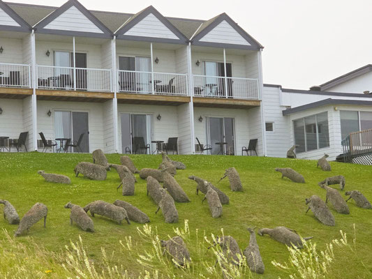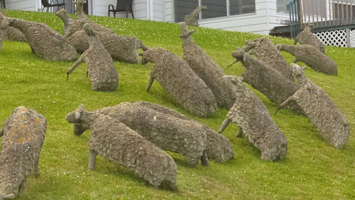Nebenan warten hölzernen Figuren auf Flössen auf die Flut, um in See zu stechen. All das kümmert die Schafherde wenig, sie grast bei jedem Wetter friedlich an den Hängen des Dorfes.