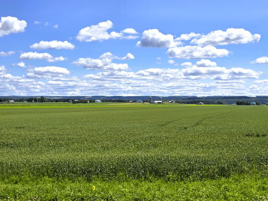 Ab jetzt betreten wir wieder einmal Neuland. Wir fahren dem Südufer des Sankt Lorenz-Stroms entlang nordwärts. Für einmal - gegen unsere Erwartung - ist das Gebiet nicht gänzlich mit Wald bedeckt, sondern riesige Ackerflächen erstrecken sich bis zum Horizont.