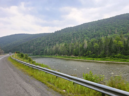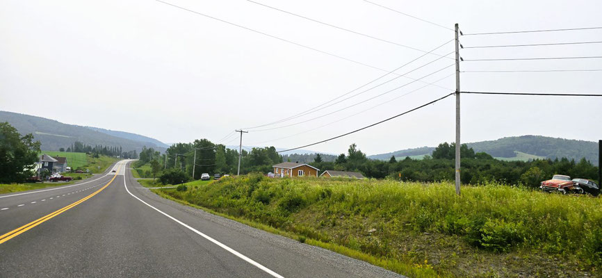 Wir verlassen die Sankt-Lorenz-Strom Küste und biegen ab gegen Westen. Es sind immer noch 180 km bis nach Campbellton, unserem heutigen Ziel. Auch hier kein blauer Himmel in Sicht. Die starken Winde treiben die Rauchpartikel von den nördlichen Waldbränden in unsere Richtung und trüben die Luft.