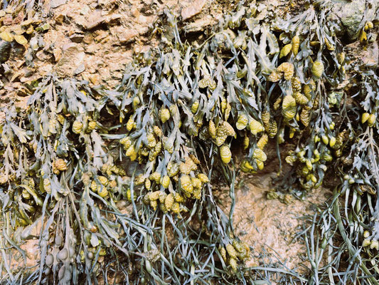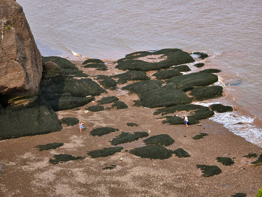 Die bizarren Felsformationen - gem. Prospekt 'Blumentöpfe' - stehen bei Flut im meterhohen Wasser und werden von Kajak-Fahrern ausgekundschaftet. Bei Ebbe sinkt der Wasserstand - wir schätzen um 6-8m - und wir können trockenen Fusses um die mit Algen bewachsenen Felsen spazieren.
