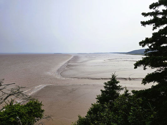 Der Petitcodiac River fliesst vorbei an den Hopewell-Felsen in die Bay of Fundy. Wir folgen dem enger werdenden Flusslauf ins Landesinnere nach Moncton, wo wir eine weitere Eigenheit von solch grossen Gezeitenwechseln beobachten möchten - eine Bore Tide/Gezeitenwelle.