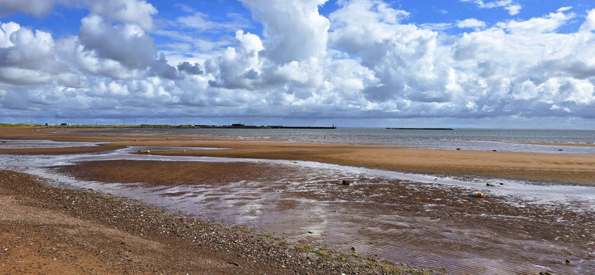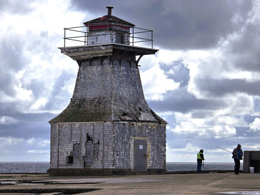 Der Wind bläst in alle Richtungen und warm anziehen ist angesagt! Trotzdem laufen wir der Beach entlang zum alten Fährhafen und besichtigen den letzten - noch stehenden - Leuchtturm aus Holz.