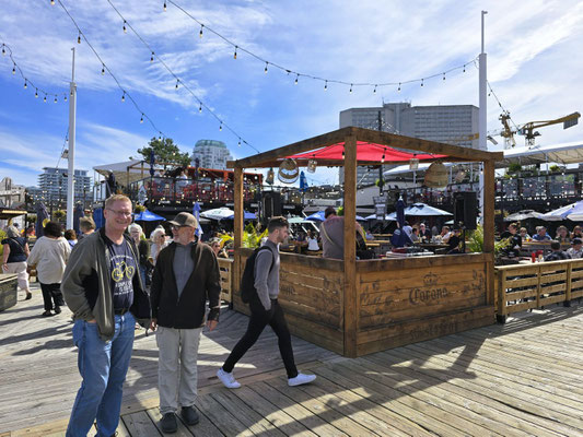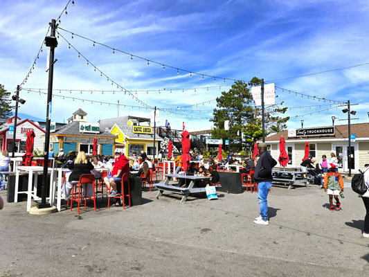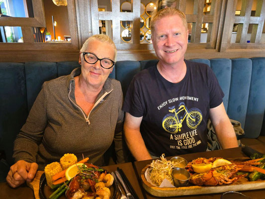 Langsam wird die Sonne den Wolken mächtig und wir laufen den Hügel runter zum Hafen. Hier beschliessen wir unseren Stadtbesuch am Meer in einem Seafood Restaurant und Ramon bekommt seinen ersten Hummer.